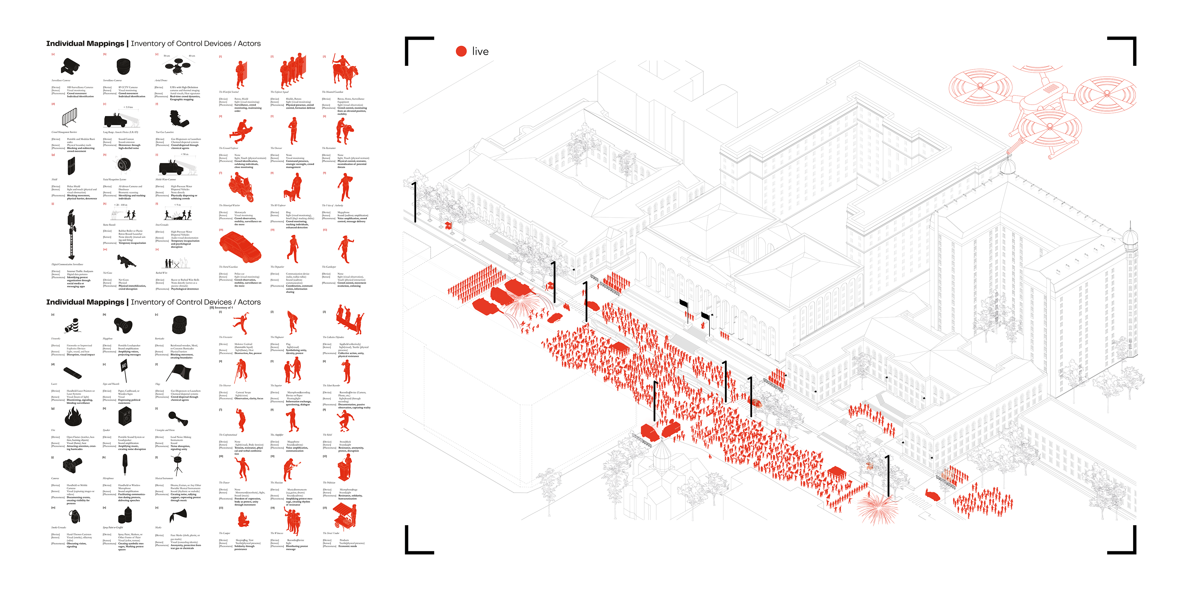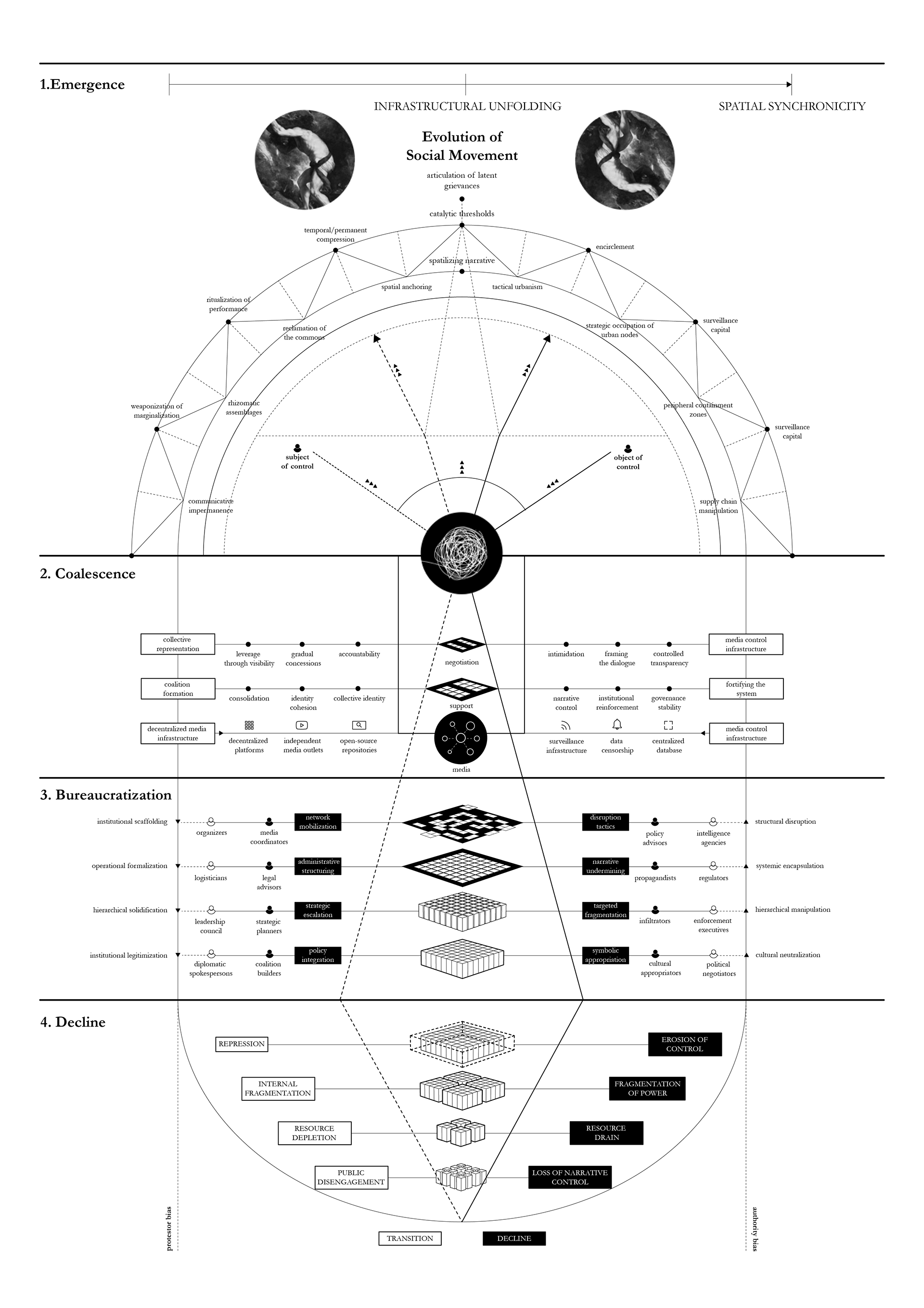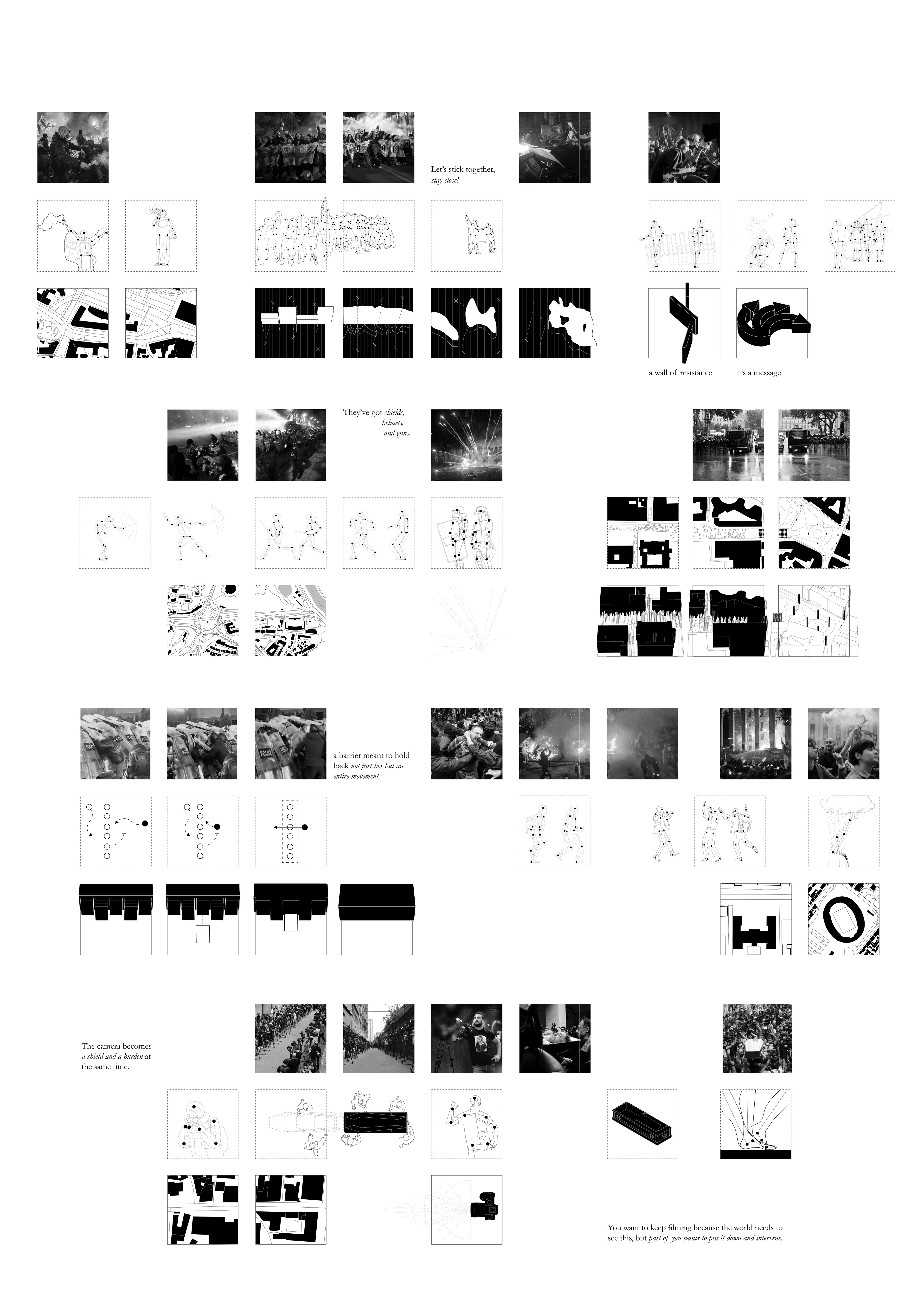 Partition walls serve not only as surfaces for displaying protest material but as agents that sculpt the internal landscape. They become hiding walls, dead-ends, misdirections, or temporary refuges. Their placement responds to the rhythm of the waffle slab above, whose grid governs shifts in direction and cadence; where the structural logic bends, the maze folds, dissolves, or renews itself. This interplay between overhead structure and ground-level layout produces an interior that oscillates between coherence and unpredictability.