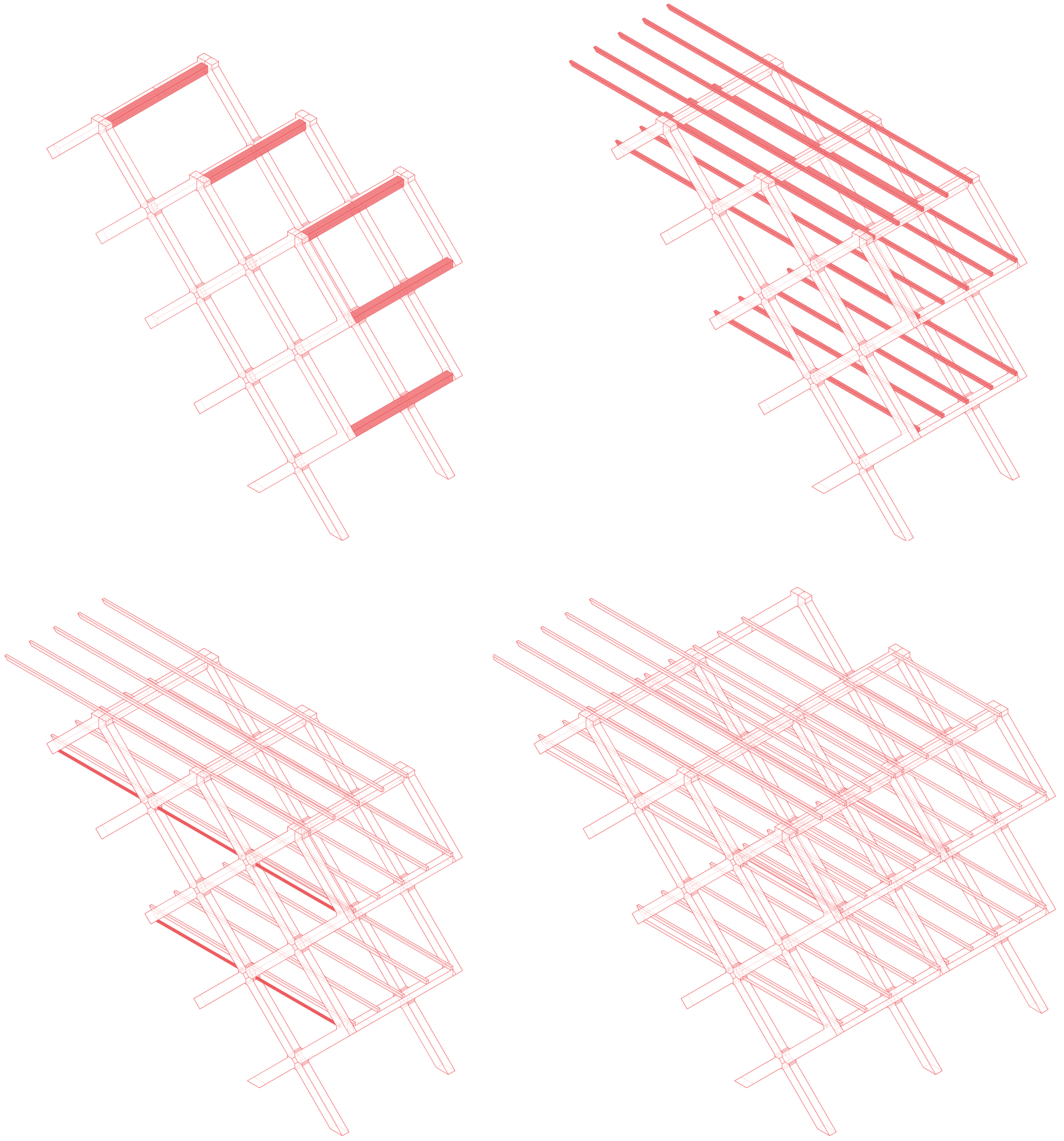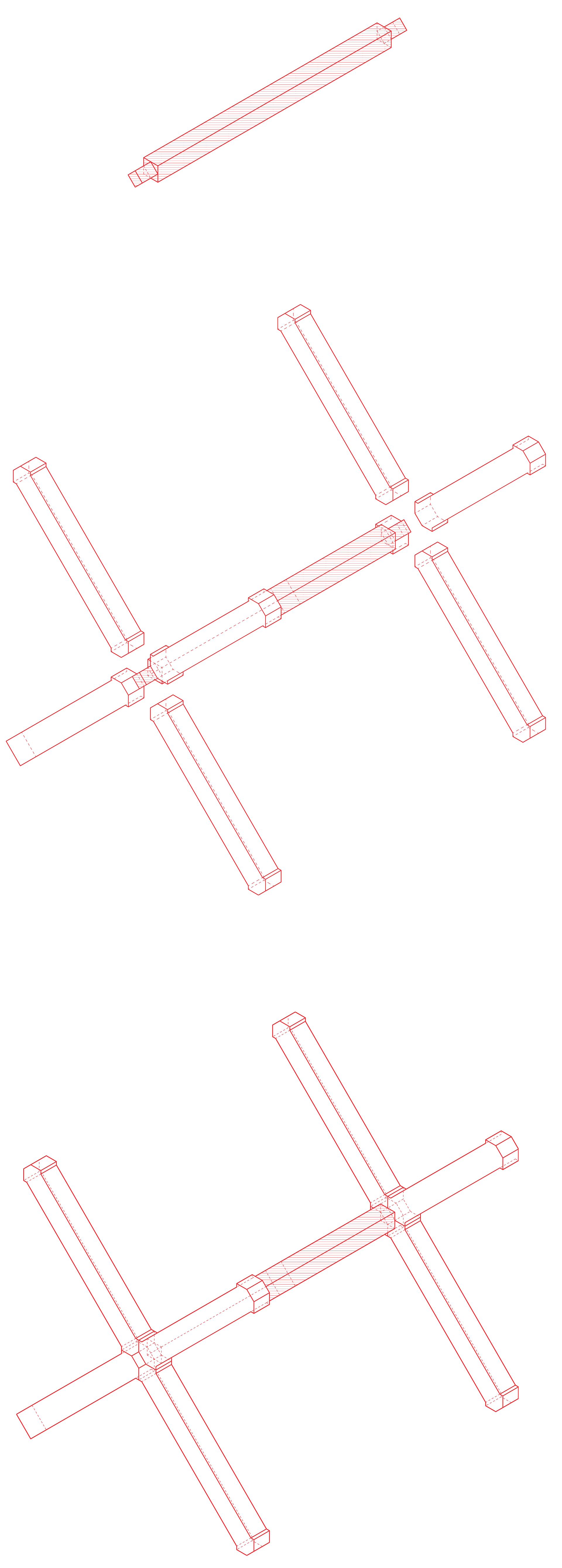 Image (Below-Left): Steel tensioners are introduced at the junctions of the reinforced concrete columns, providing additional stability and reinforcing the structural integrity of the systemImage Image (Below-Right): The second module is added to the system, extending the structural logic and reinforcing the modular rhythm of the overall design