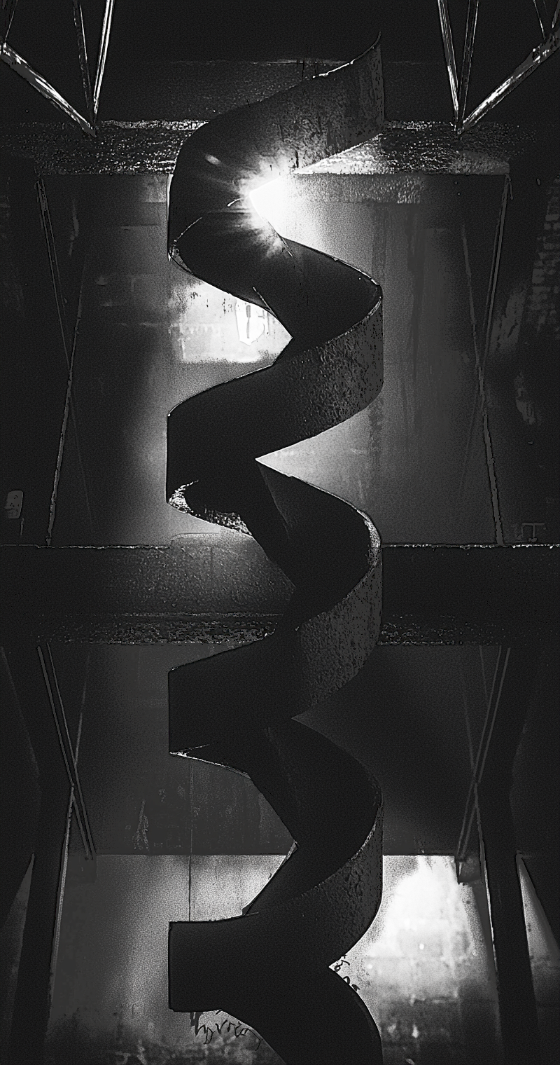 Image (Left): A dramatic interior view featuring a sculptural spiral staircase, with directional light emphasizing vertical circulation and the raw structural framework