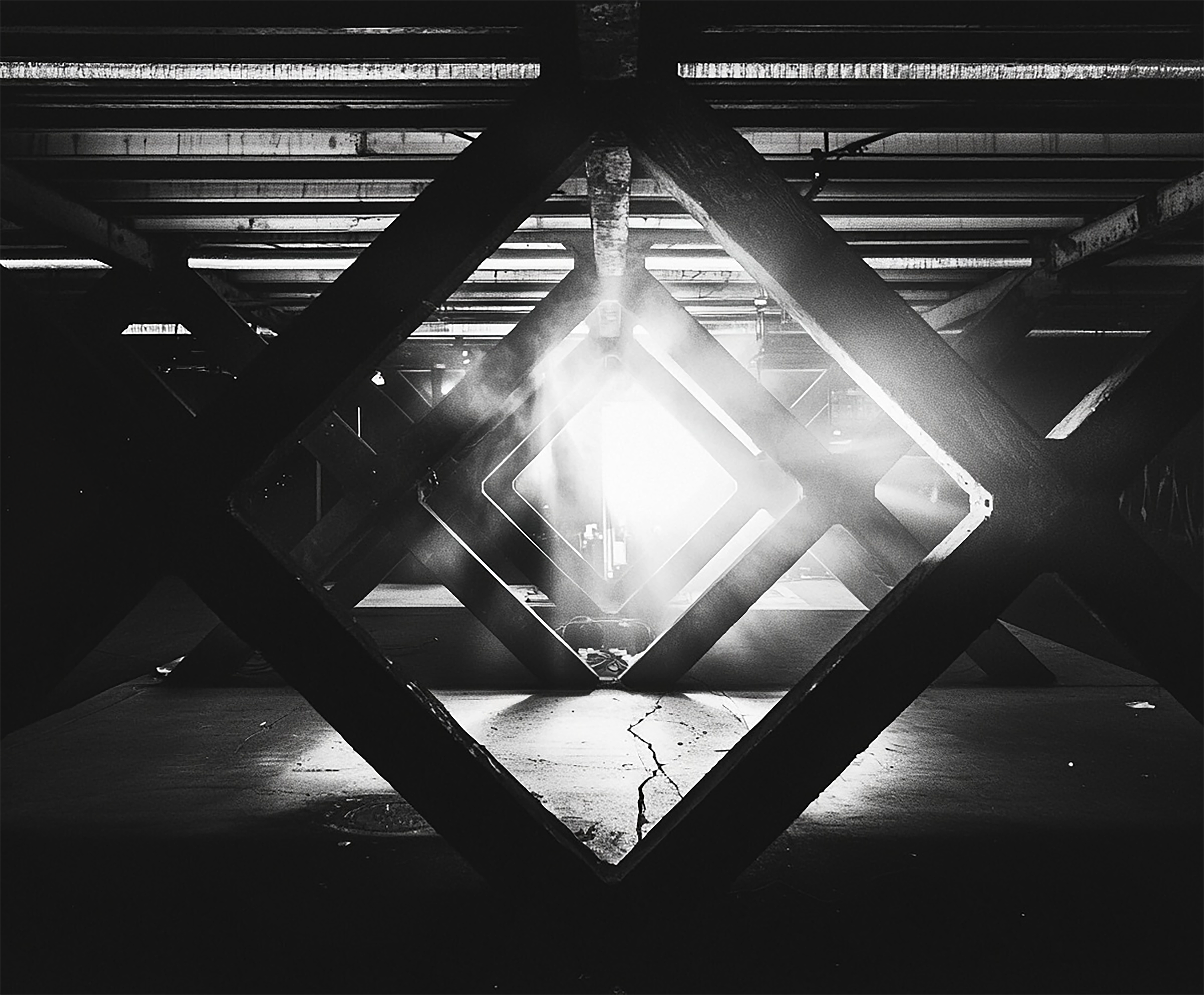 A frontal view of aligned X-shaped frames, creating a layered geometric corridor with light emphasizing symmetry and structural clarity