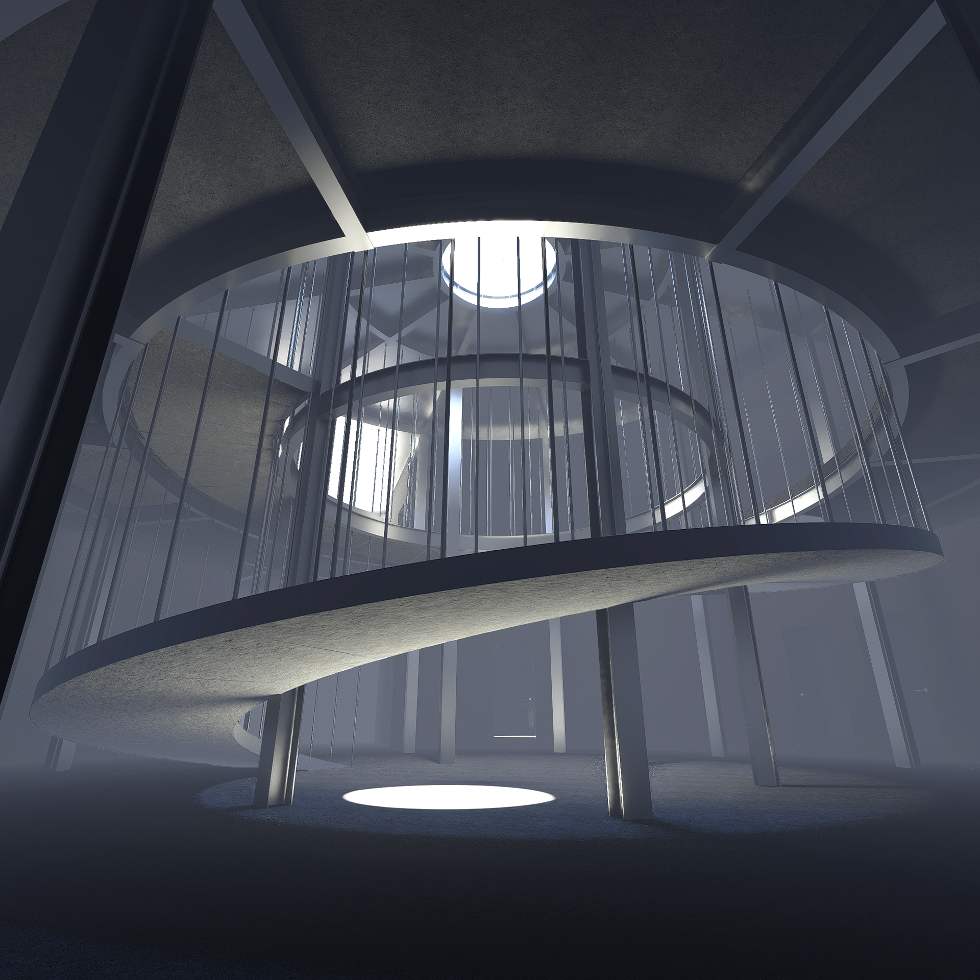 Image (Above-Right): An interior perspective capturing the dynamic flow of one of the spiral staircase circulations