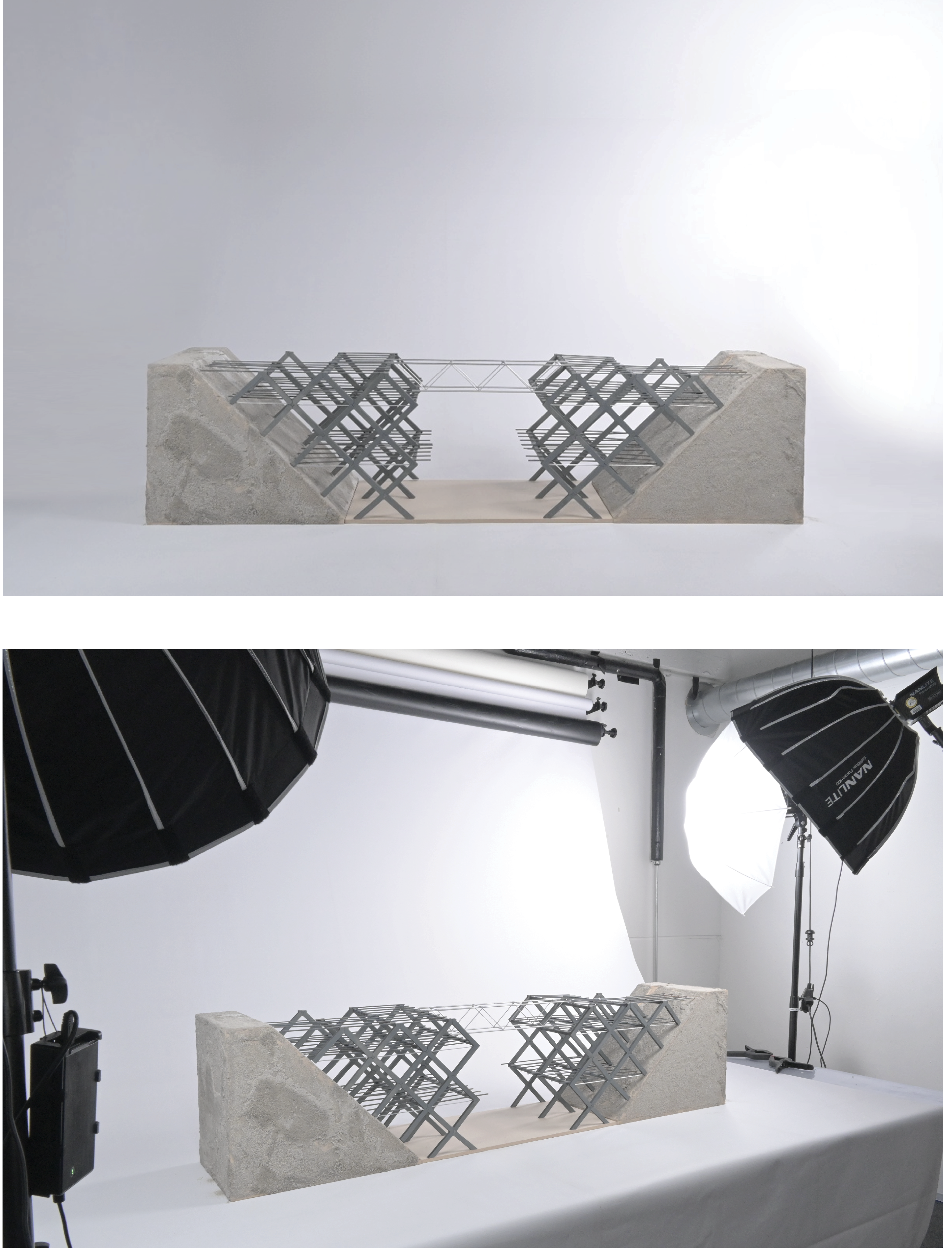 Image (Right-Below): A frontal view of aligned X-shaped frames, creating a layered geometric corridor with light emphasizing symmetry and structural clarity