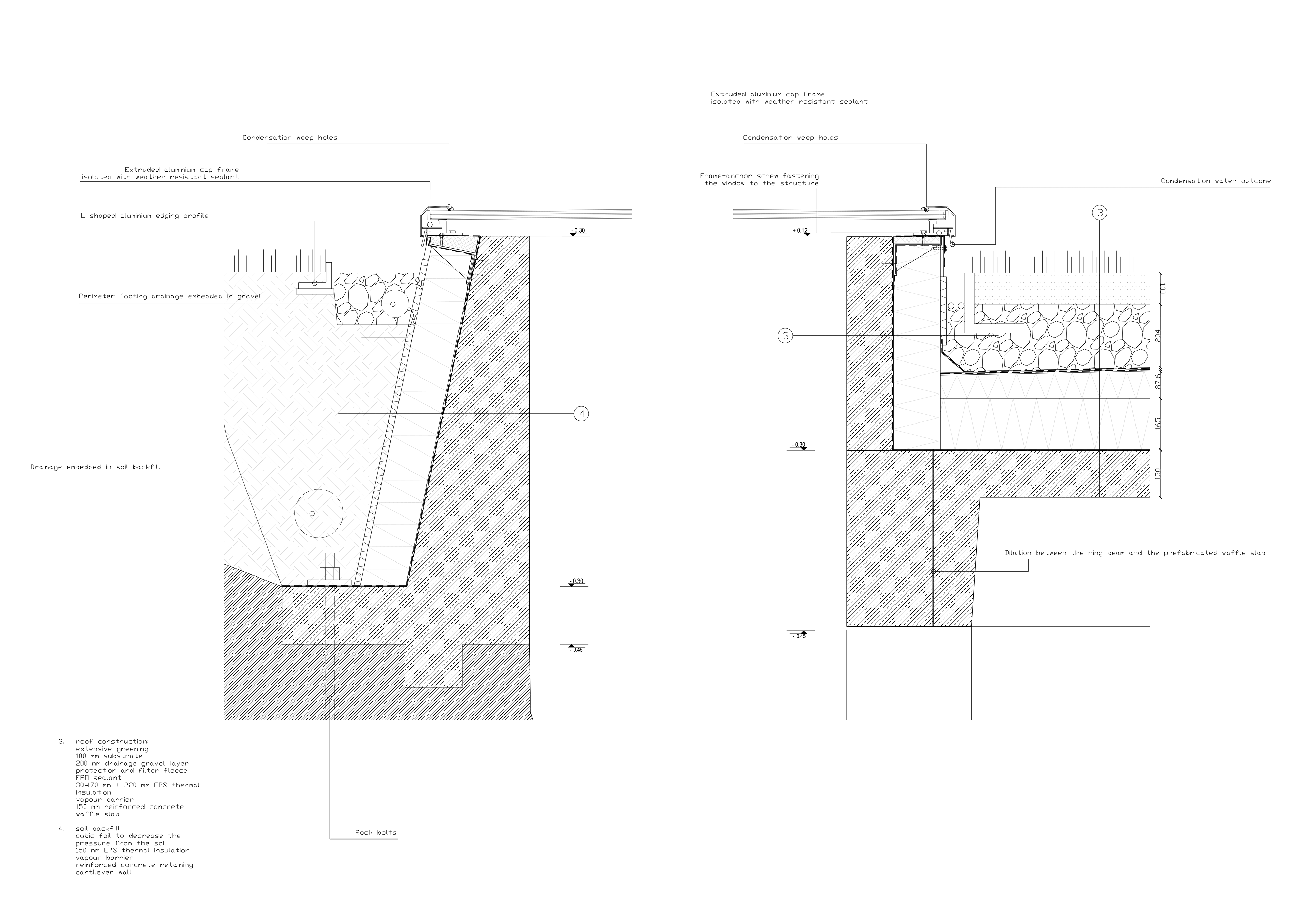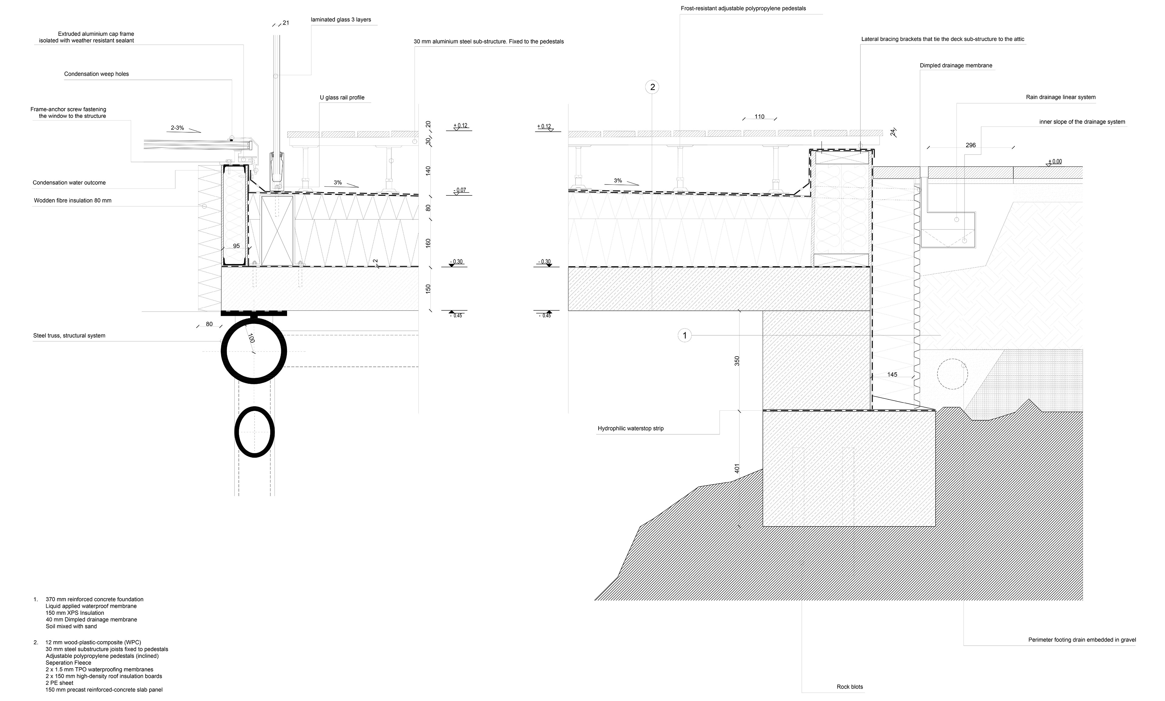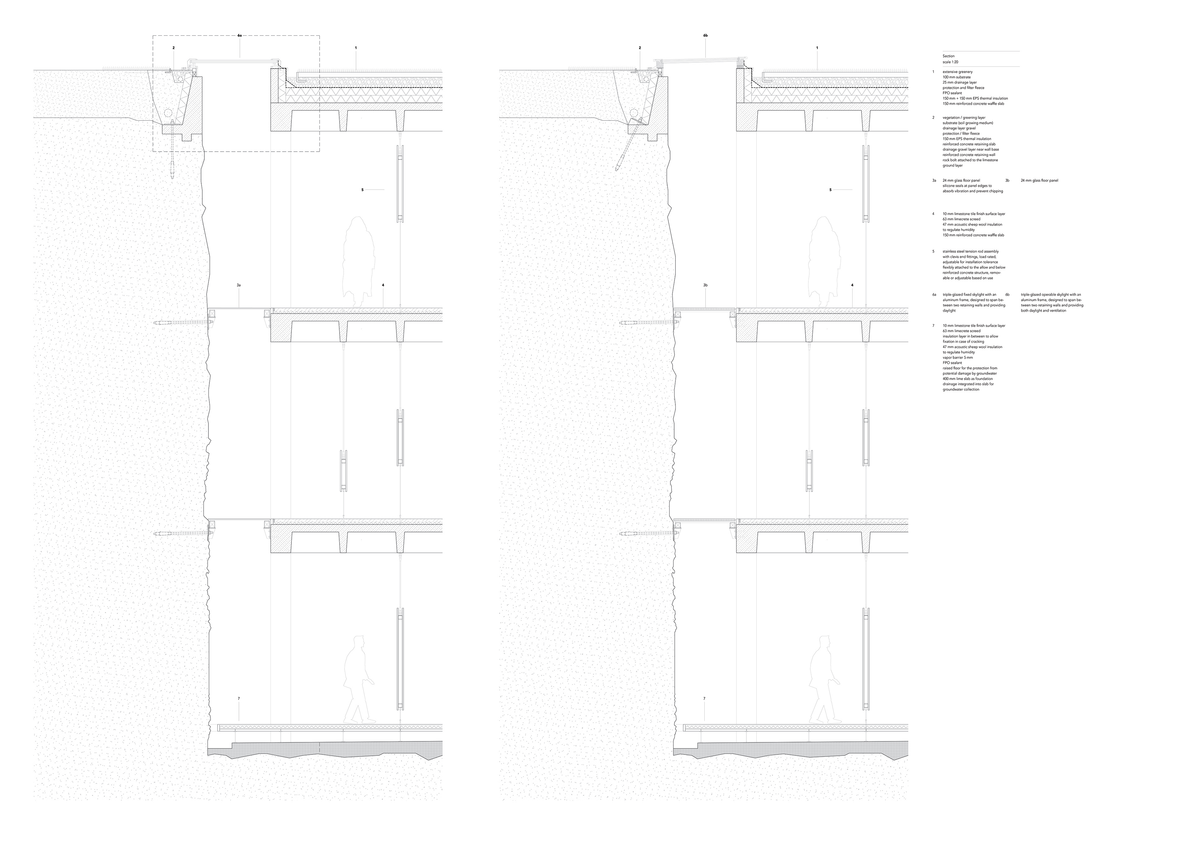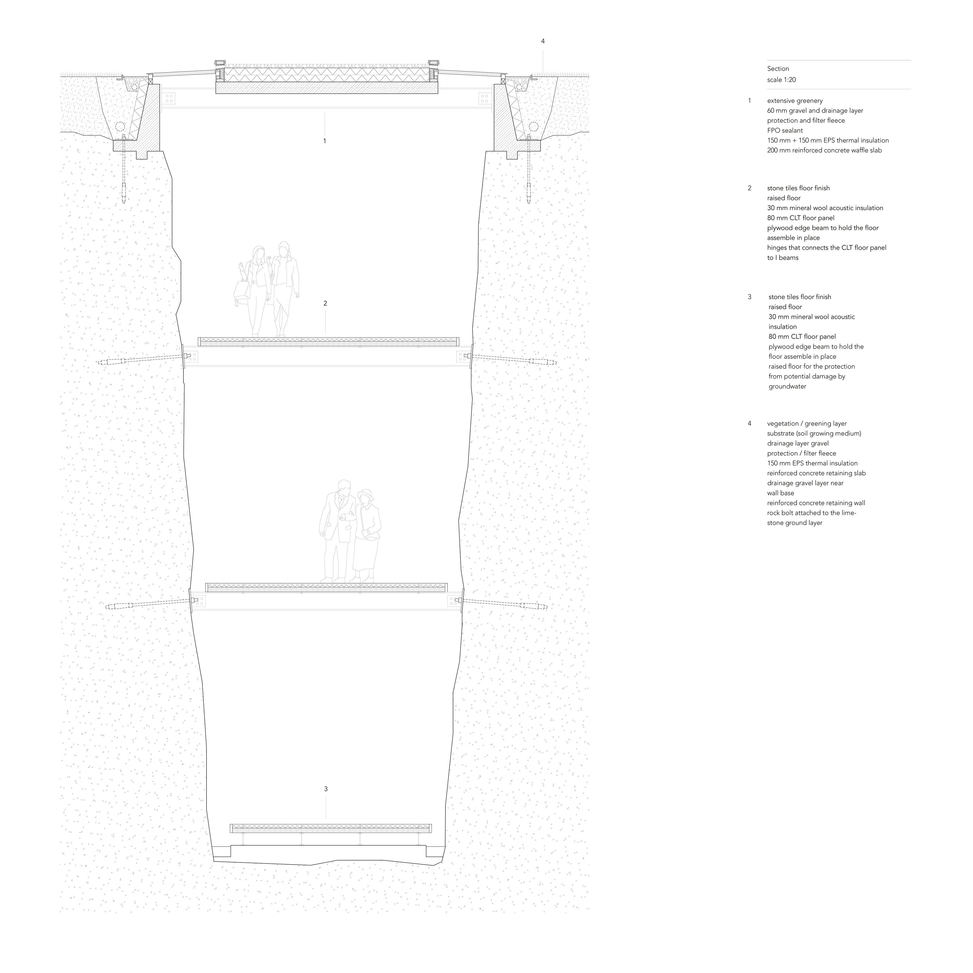 Image (Right): A 1/5 detailed section showcasing the close-up of the connection between the roof structure and the underground limestone