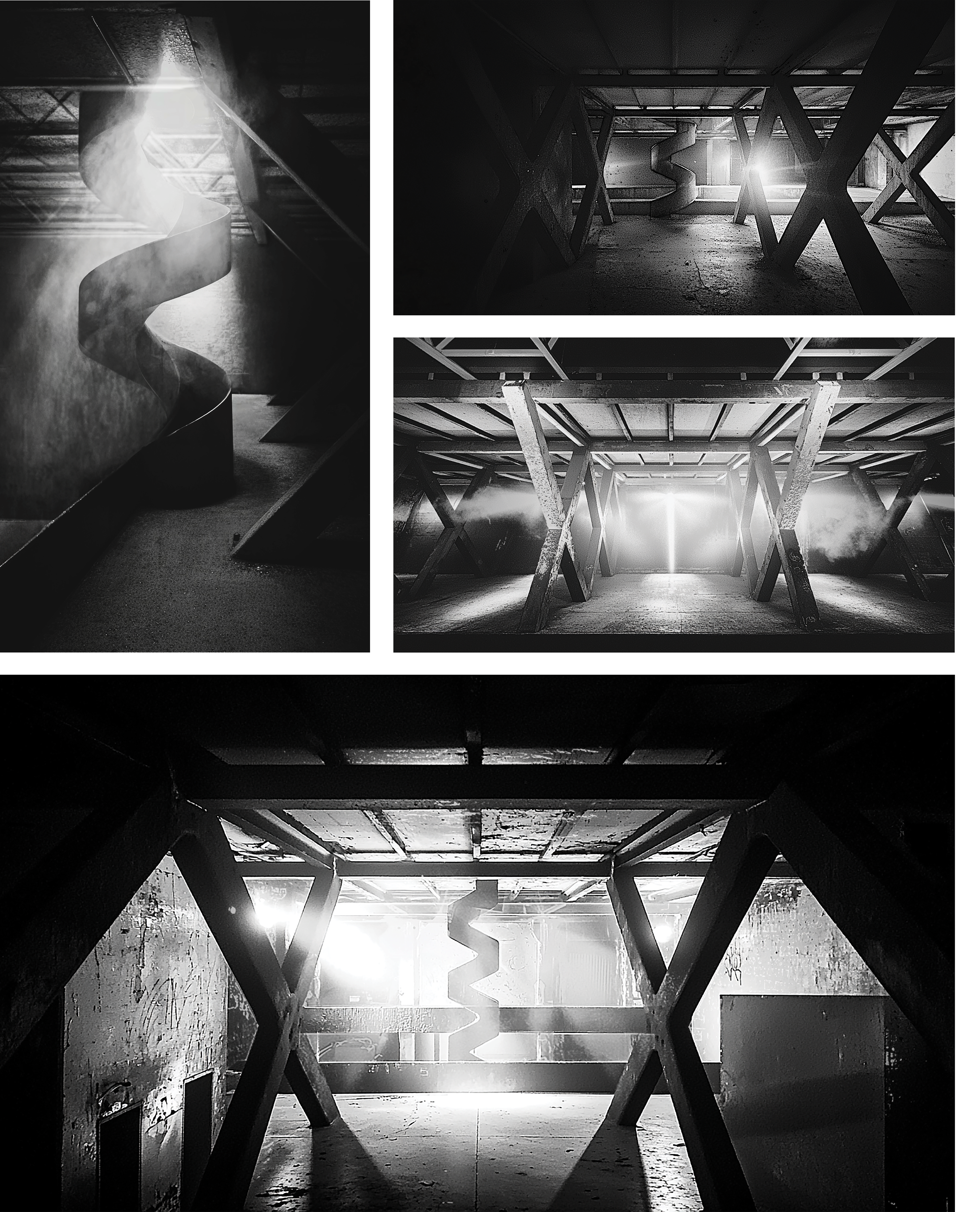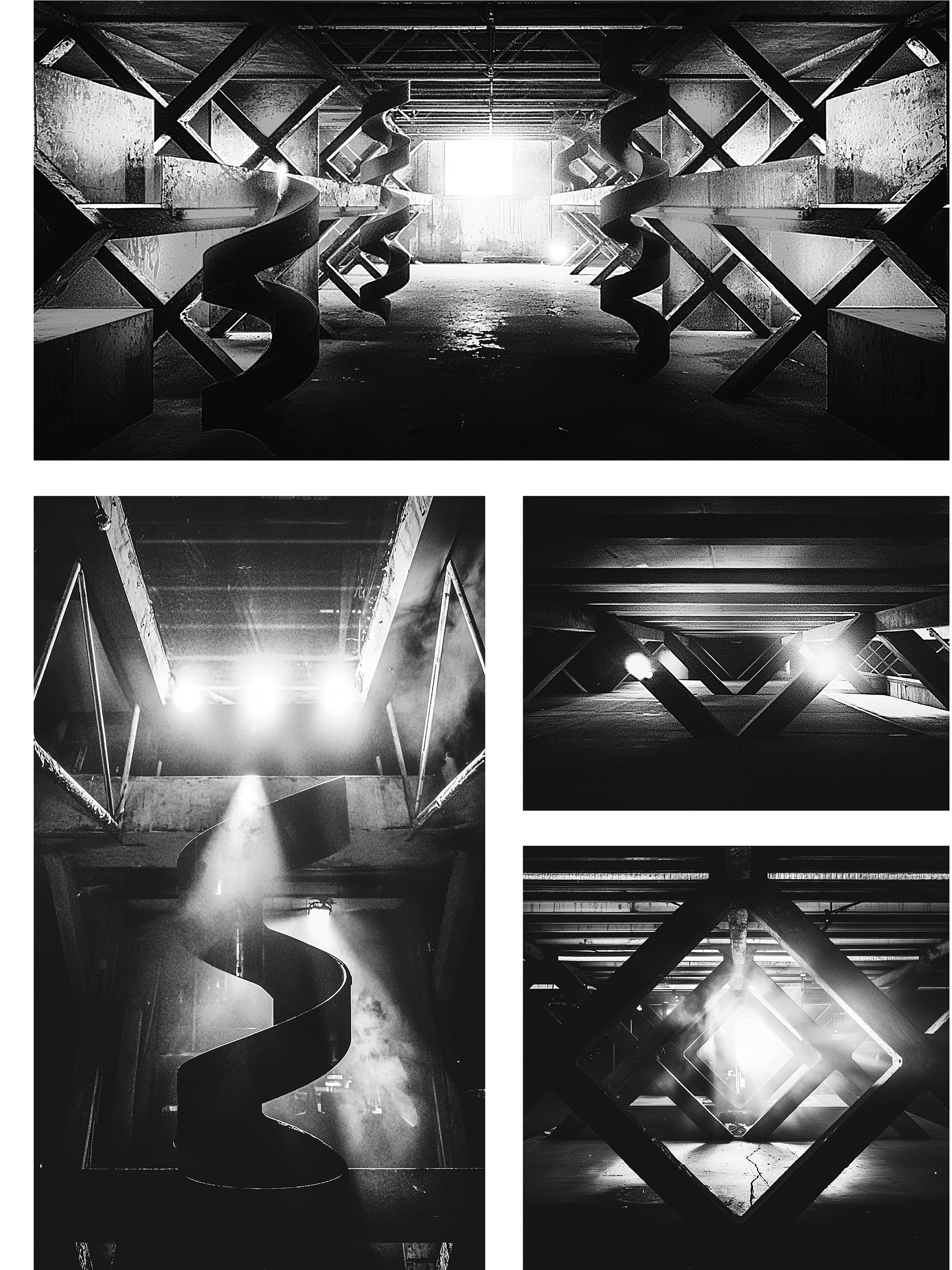 Circulation is choreographed as a fragmented and multi-layered sequence. Movement does not follow the hierarchy of a singular staircase or central spine; instead, visitors traverse the architecture obliquely—threading through structural trusses, slipping behind walls, and descending into interstitial shadows. Such spatial logic aligns with the ethos of underground culture itself: distributed, non-linear, and deliberately unpredictable. Orientation is less a matter of precision than of attunement, a negotiation between body and space.