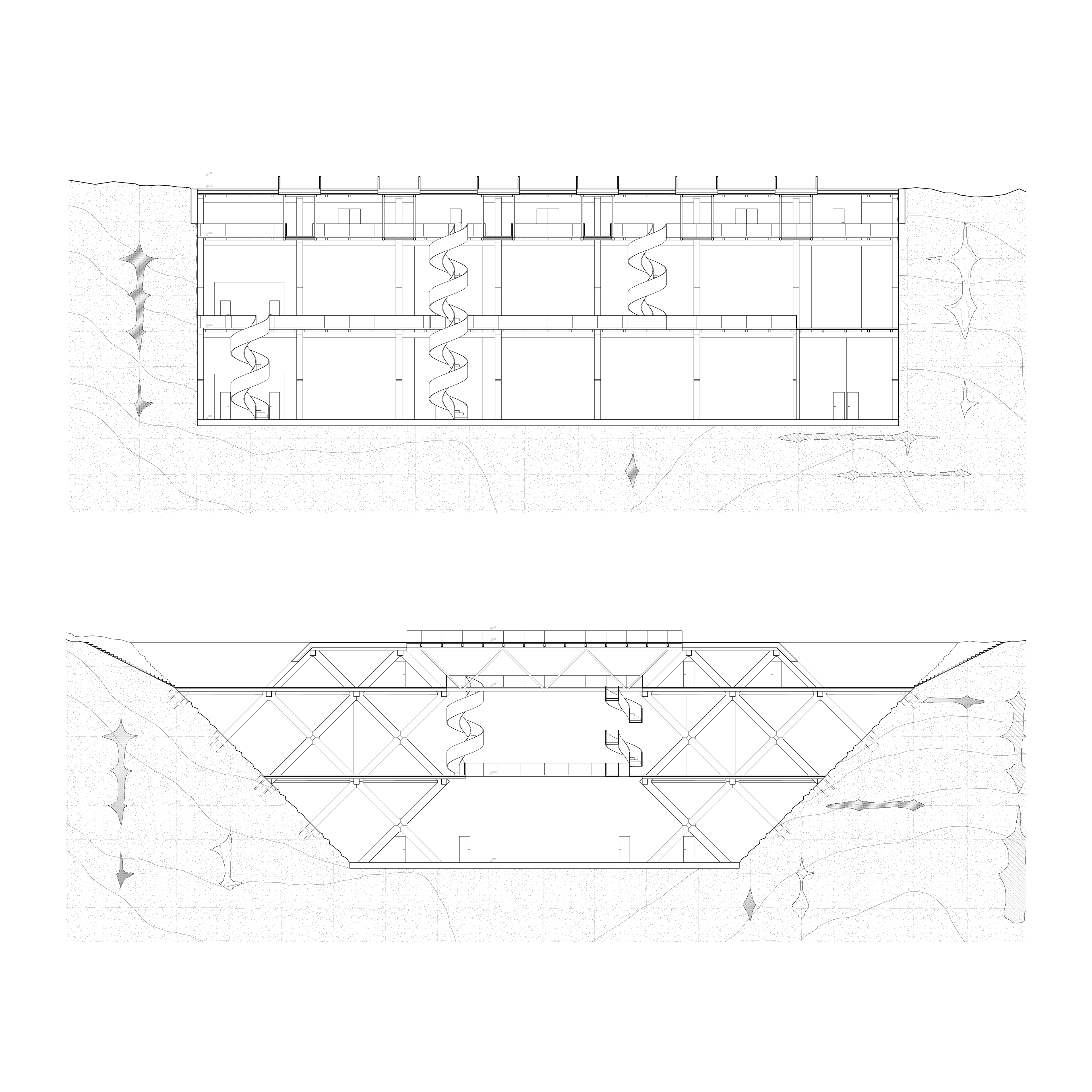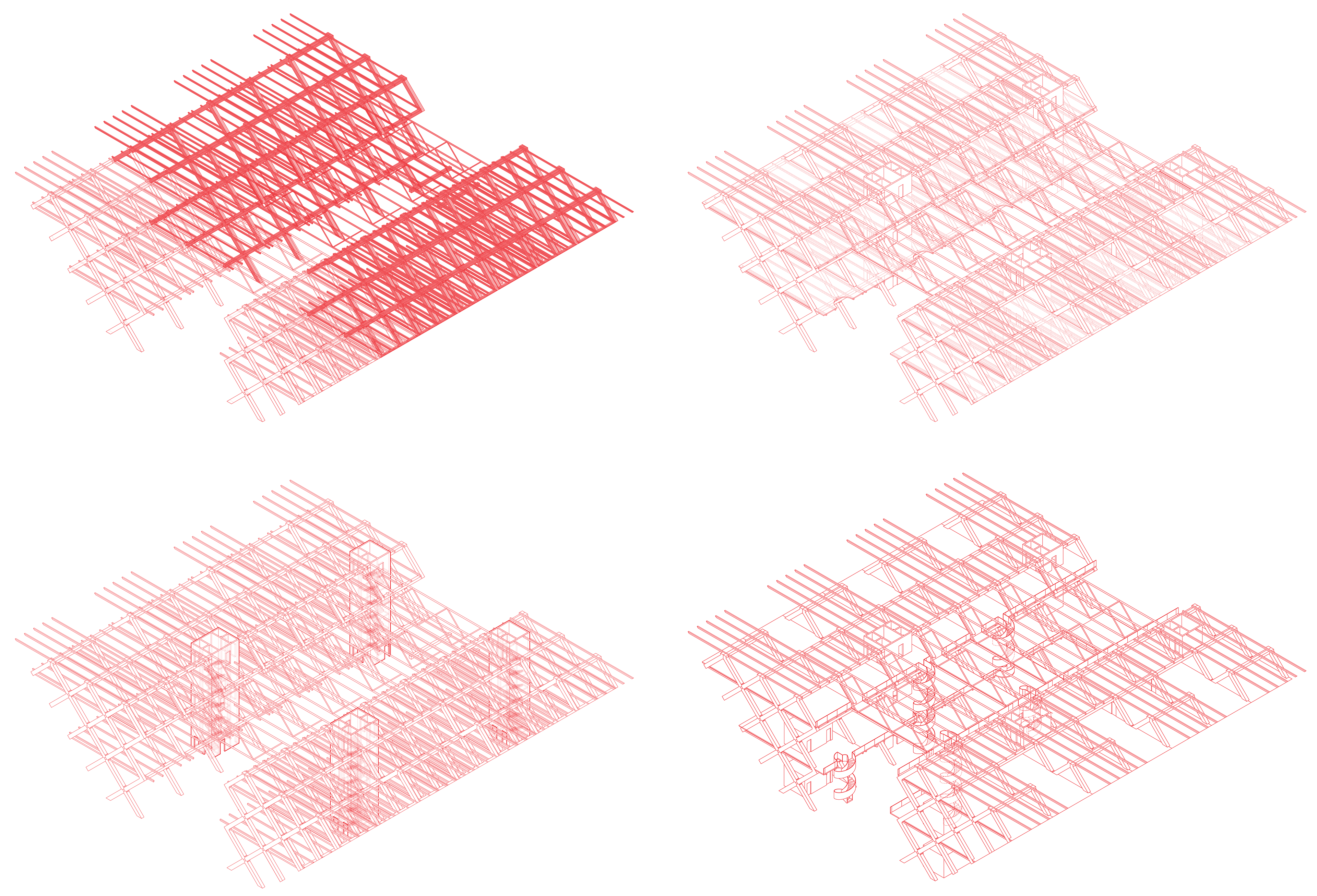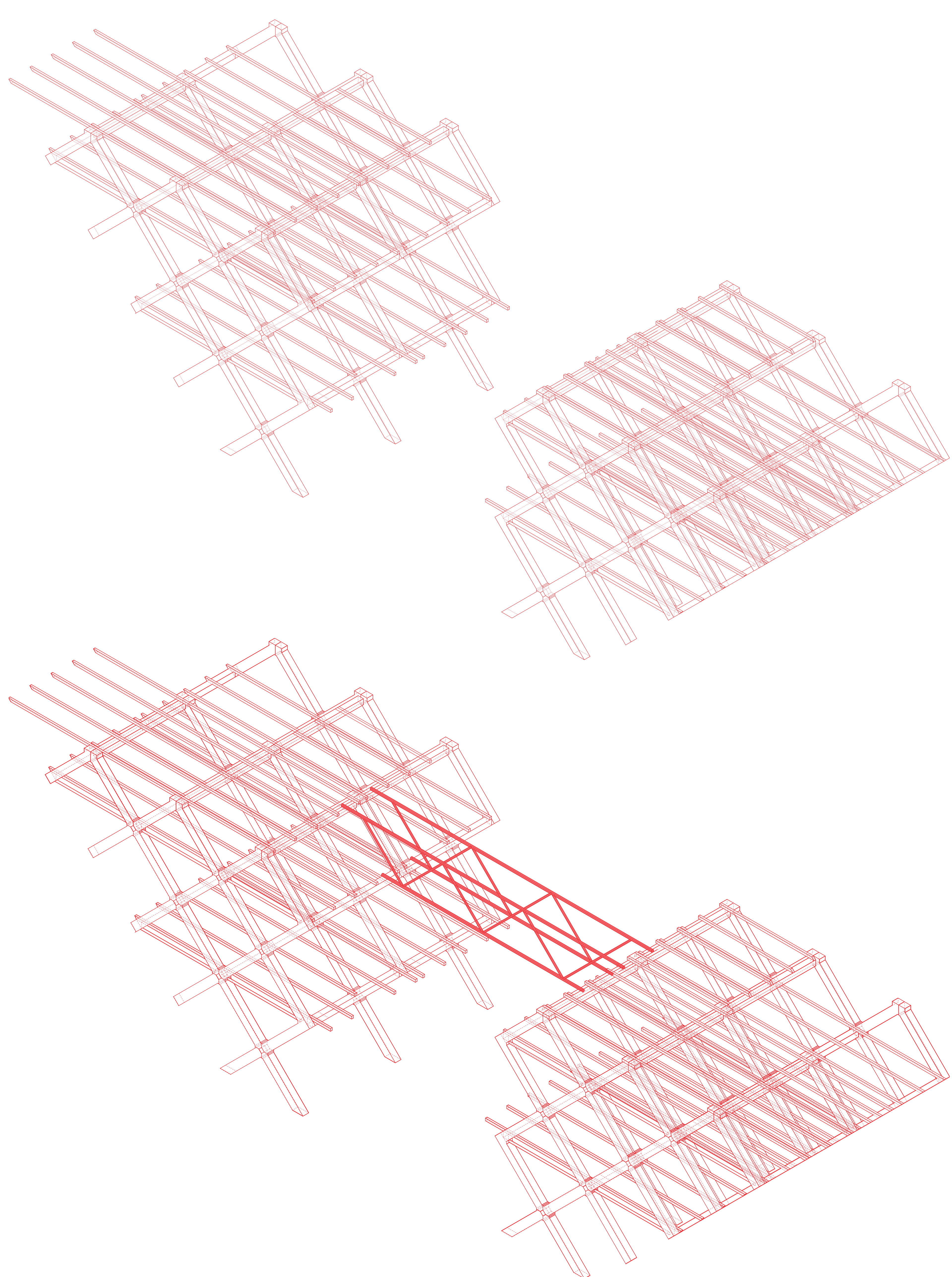 Image (Below): A steel truss system is introduced to support the bridges above, enabling long-span connectivity while contributing to the structural clarity and tectonic expression of the design