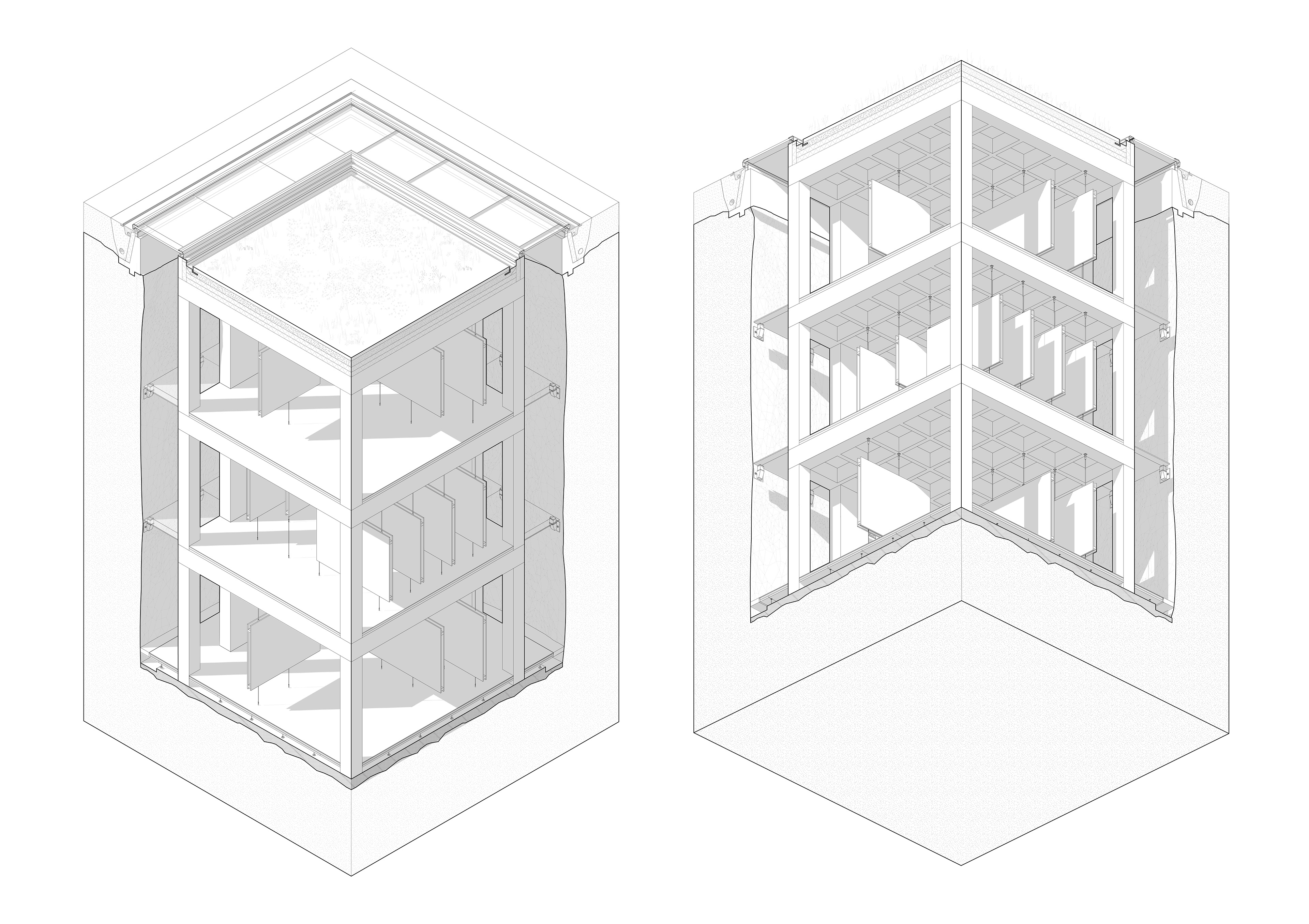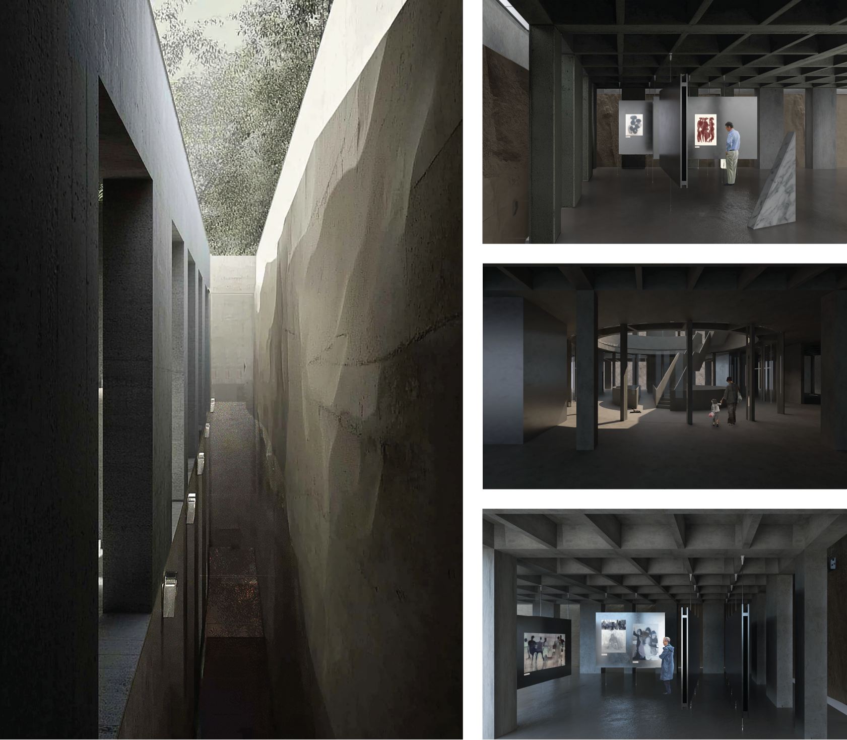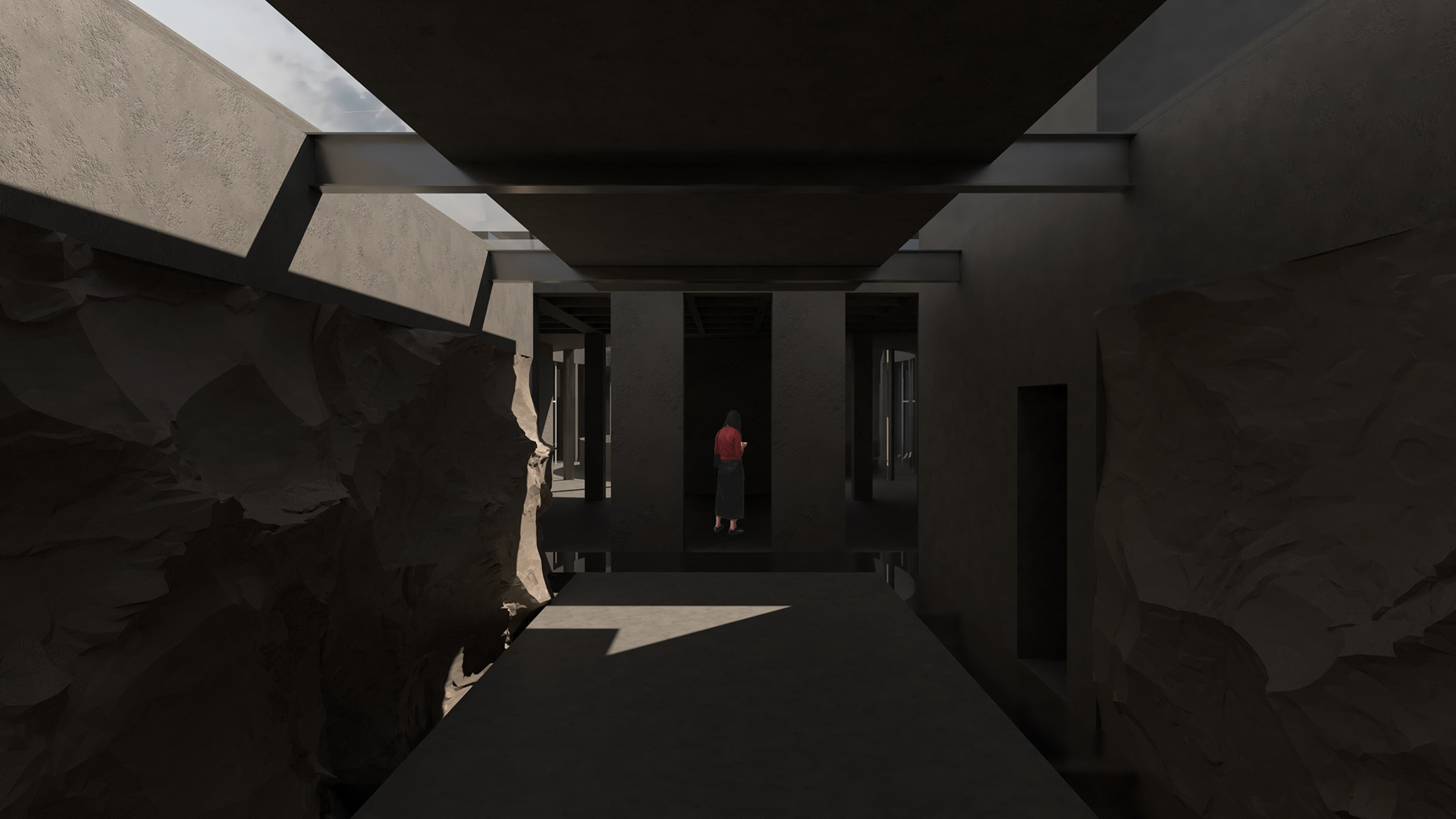 Acoustic design further shapes the subterranean environment. Footsteps are dampened through insulation, yet the openness of the tunnels allows sound to bleed between levels, producing a layered auditory experience that complements the visual and spatial complexity. Circulation is orchestrated through both the primary entrance core and a secondary core adjacent to the exhibition hall, functioning simultaneously as evacuation routes and as instruments of spatial ambiguity. These cores reinforce the tunnels’ role as spaces of controlled disorientation and enforced anonymity, allowing visitors to navigate in ways that are experiential rather than purely directional.