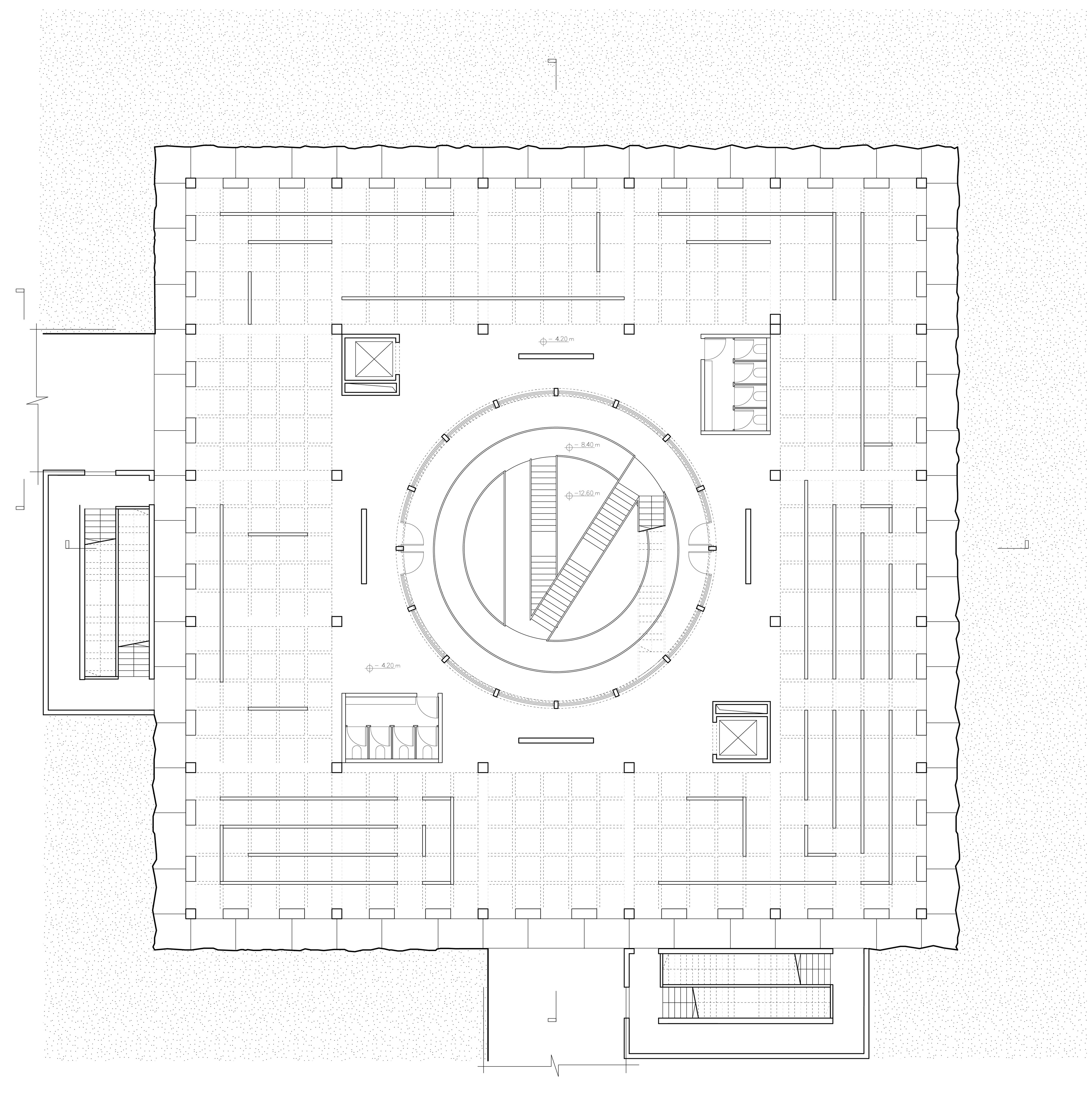 The library operates not merely as a container of knowledge, but as an architectural instrument calibrated toward disruption, ambiguity, and strategic protection. Its structural logic—reinforced shear walls enclosing a steel-framed atrium—establishes a spatial cadence akin to a labyrinth. This rhythmic sequencing produces an architecture of multiplicity and concealment: a space that extends an invitation while simultaneously permitting withdrawal, opacity, and anonymity.